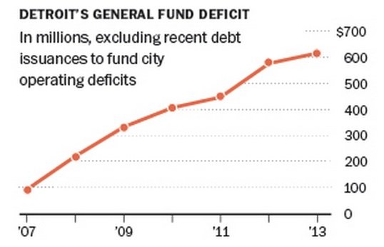 One of the most reliable indicators of economic distress — whether for a company, family, an individual or a city — is the operating deficit, which is the difference between income and expenses. Look what has happened to Detroit’s since 2007: